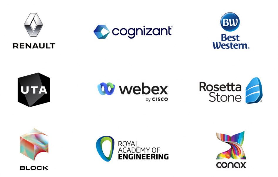 3D 徽標(biāo)的示例包括:Renault、Cognizant、Block、Webex、Best Western、Rosetta Stone、UTA、Royal Academy of Engineering 和 Conax。